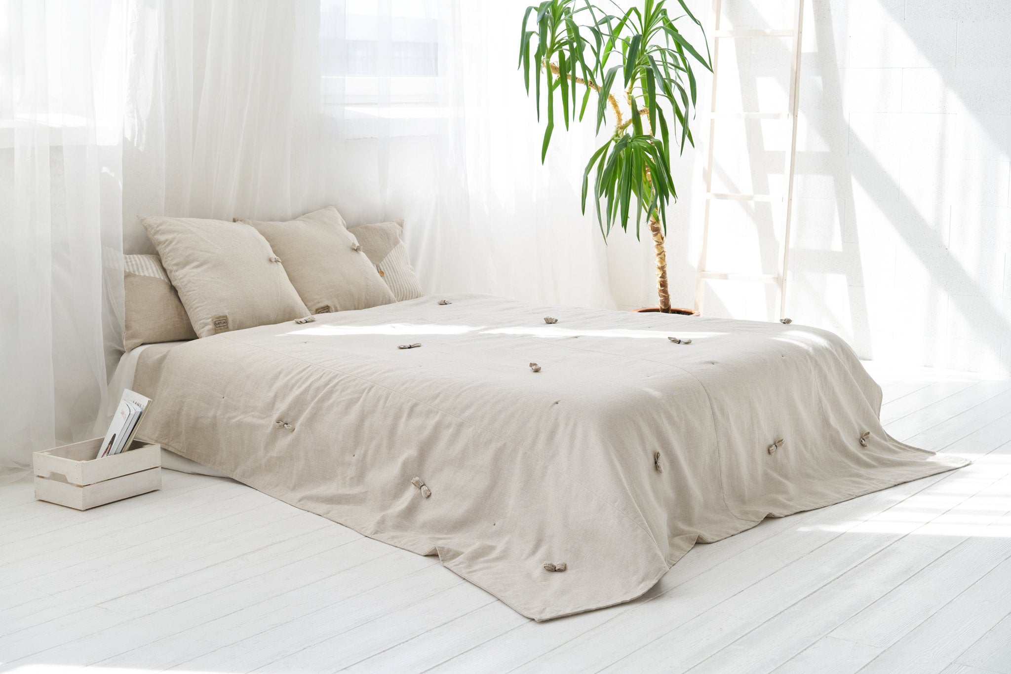 A two layers quilted beige Linen Bedspread with 5mm fiber in between specially for you, for your home decoration and coziness of your bedroom. Bedspread is decorated with small ribbons, that could be taken away and exchanged with another decorations. Complete the look with the same style matching Decorative Linen Pillowcase, with decorative small ribbons (link). If you have an idea, or want to have one-of-a-kind piece made just for you? Please do not hesitate and request your special custom order. I’ll be more than happy to make something just for you. All our products are unitary pieces from Gustluka collection. Made to order.